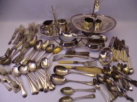MIXED LOOSE EPNS CUTLERY, swing handle breadbasket and other plated ware, a quantity