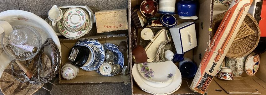 STAFFORDSHIRE TEAWARE, other glassware, china items, vintage vehicle ashtray, wooden box for Salon tea, washbasin and a Spraygen 'Brass Syringe' boxed ETC