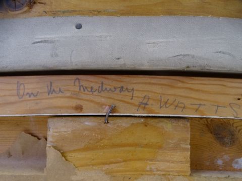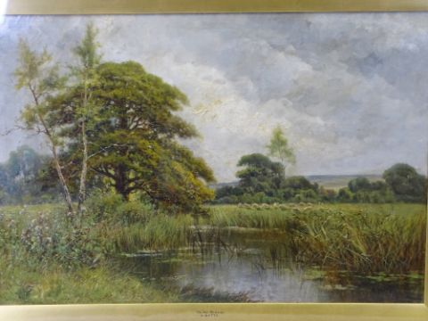 A WATTS (possibly Alice) oil on canvas under glass - peaceful river scene with sheep grazing, signed, 49 x 74cms