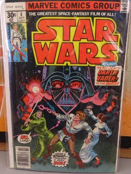 STAR WARS BEND-EMS, bubble packed figures, 1993 with Topps collector's cards, Chewbacca, R2-D2, Obi Wan Kenobi and STAR WARS COMICS 1997 NO 4 & 1978 NO 45 and a 1995 original character jigsaw, completed on board, 76 x 94cms including the board