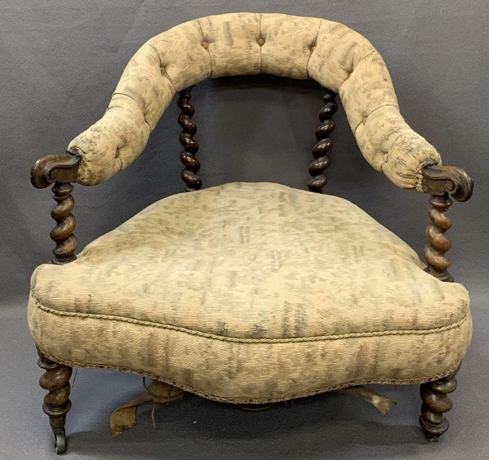 VICTORIAN ROSEWOOD PARLOUR CHAIR with barley twist supports and button upholstered top rail, 66cms H, 69cms overall W, 52cms seat D, 31cms floor to seat H