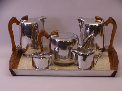 PICQUOT WARE FIVE PIECE TEA & COFFEE SERVICE on serving tray