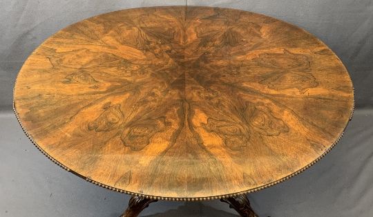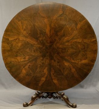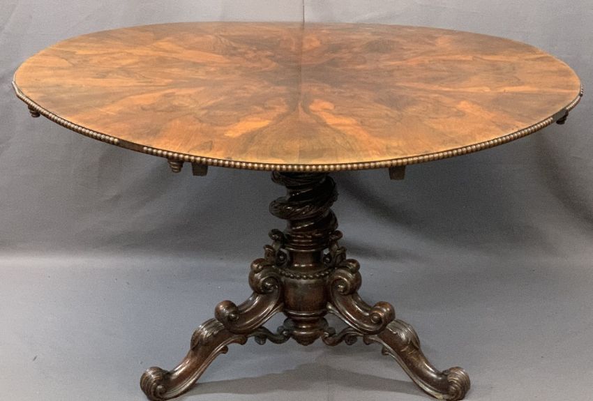 HIGH VICTORIAN ROSEWOOD BREAKFAST TABLE, the 128cms diameter top with highly figured segmented veneers and a beaded rim over an excellent twist carved column and Rococo style tripod base, 73cms H (top extremely warped, lacking some of the beaded edge detail)