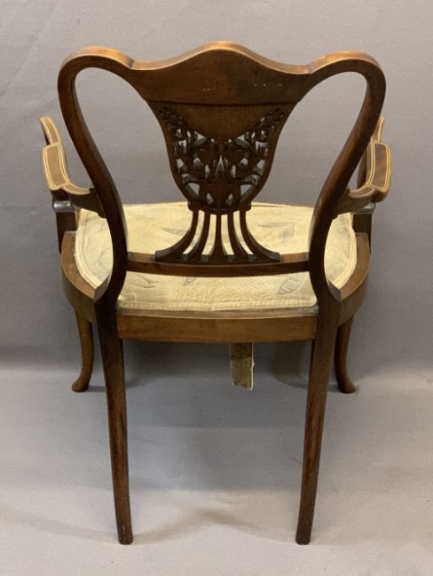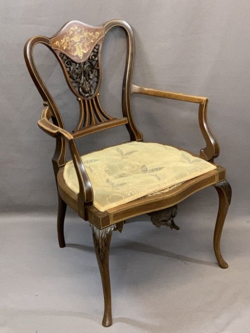 CIRCA 1900 INLAID ROSEWOOD PARLOUR ARMCHAIR having fruit and leaf inlay over an open carved central splat, 88cms H, 57cms max W, 43cms seat depth