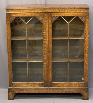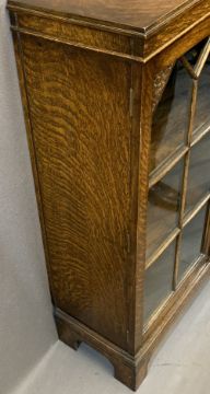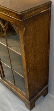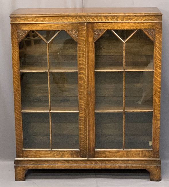 GOOD VINTAGE OAK TWO DOOR GLAZED BOOKCASE with interior adjustable shelves on corner bracket feet, 107cms H, 91cms W, 30.5cms D, Klan & Scott makers label verso