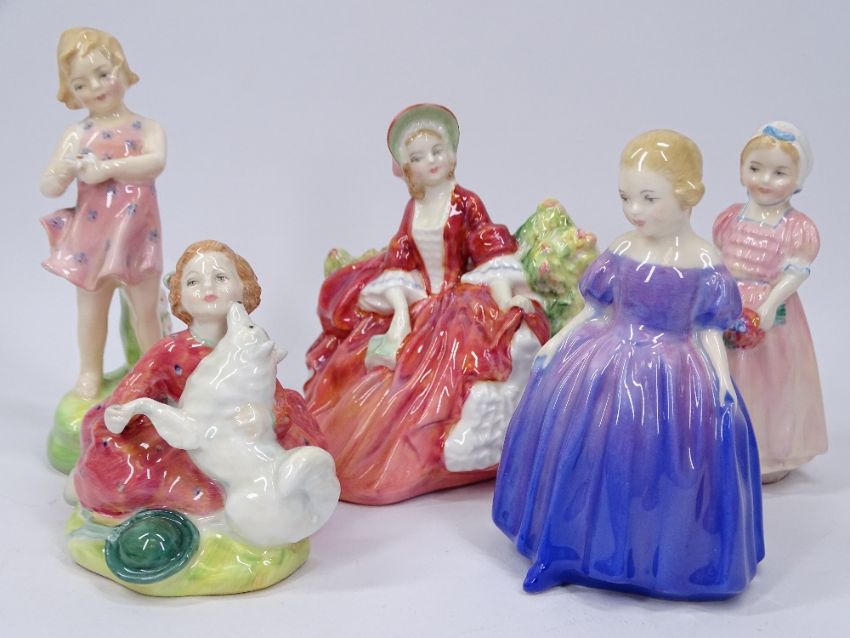 ROYAL DOULTON FIGURINES (5) - Home Again HN2167, Marie HN1370, He Loves Me HN2044, Lydia HN1908 and Tinkle Bell HN1677