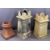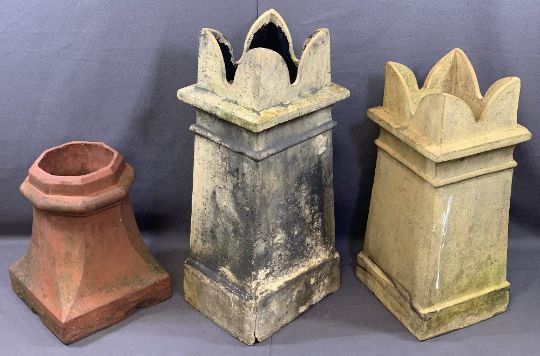 VINTAGE CHIMNEY POTS (3) including two castellated top examples, 78 and 66cm heights and a small terracotta pot, 42.5cms H