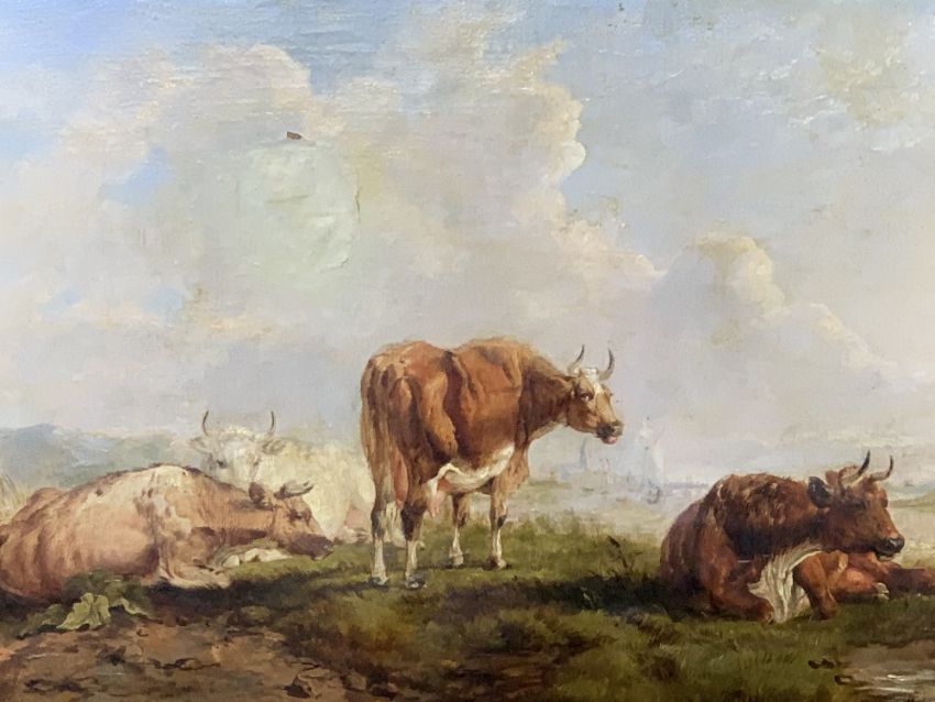 UNSIGNED oil on canvas - grazing cattle with boats to the background, 40 x 60cms