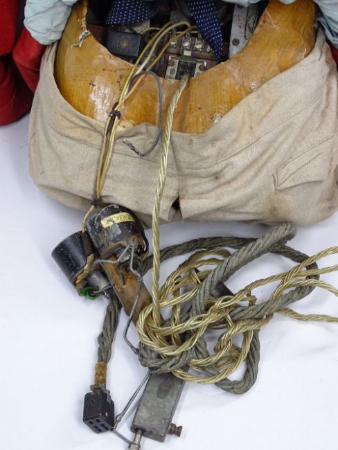 EARLY TO MID 20TH CENTURY PAPIER MACHE VENTRILOQUIST DUMMY sporting a red jacket and turn up pants with braces, converted to electrical mechanical use (changes and adjustments, hair mostly lacking, jacket somewhat moth eaten, general scuffs and scrapes), 110cms L