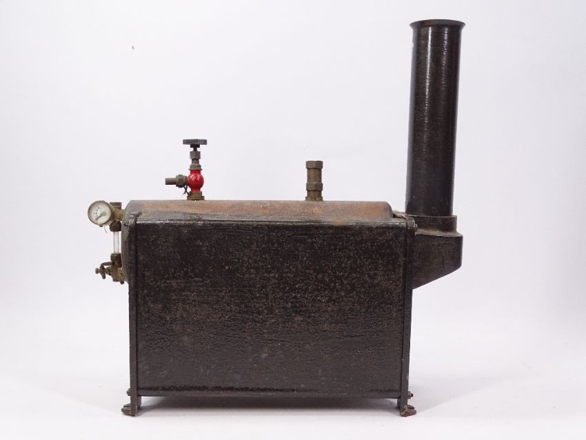 LIVE STEAM MODEL OF A BOILER with valve taps and pressure gauge, 30cms max H, 30cms L, unmounted platform type, no burner