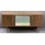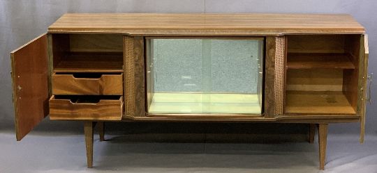 MID-CENTURY BEAUTILITY WALNUT EFFECT SIDEBOARD of central mirrored cabinet with sliding glass doors and flanking cupboard doors on tapering supports, 80.5cms H, 168.5cms W, 49cms D