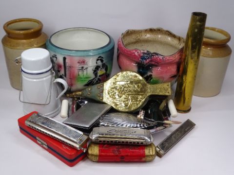 MIXED COLLECTABLES including three vintage harmonicas, Art Deco chrome tableware, other metalware, two pottery planters and two stoneware honey pots