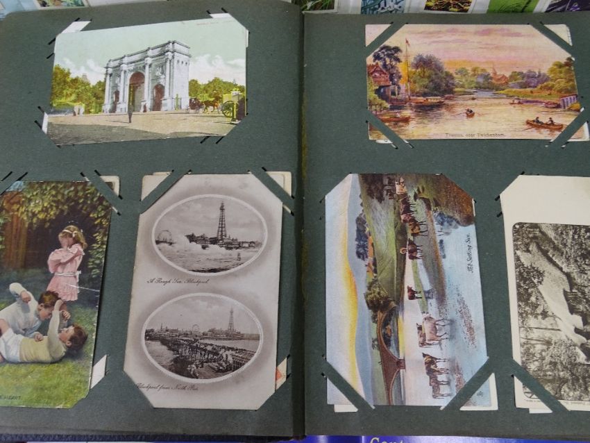 VINTAGE POSTCARD COLLECTION with a quantity of cigarette, tea, other cards and silks, the postcards numbering 900 plus contained within three vintage albums, mainly UK, Topographical, some military, North Wales, seaside and busy street scenes