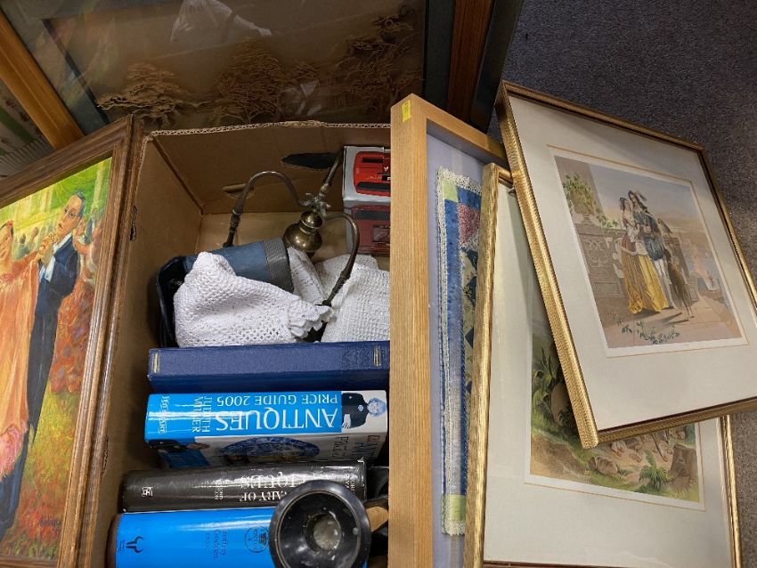 MIXED COLLECTABLES to include a small quantity of linen, boxed Polaroid Rossa Ltd Edition camera and one other, antique and collector's reference books, vintage boot pull, framed cork picture and JOAN DARLINGTON oil on board titled - 'The Comps', depicting a dancing couple, two Victorian prints titled 'Les Albaniens' and 'Les Depart', along with a small patchwork panel, framed