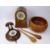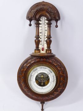 CIRCA 1900 MAHOGANY MANTEL CLOCK, carved walnut barometer with thermometer and a treen salad bowl with servers