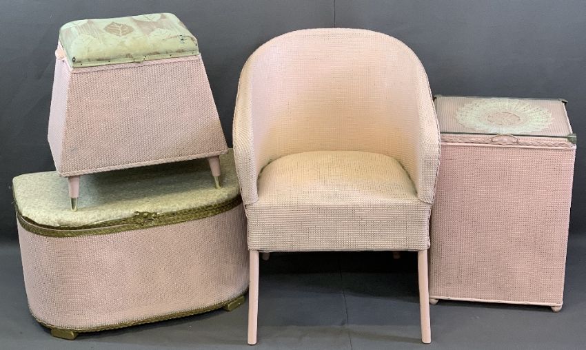 LLOYD LOOM STYLE PINK BEDROOM FURNITURE, FOUR ITEMS to include a spring seated armchair, 75cms H, 55cms W, 42cms seat depth and three various lidded baskets/blanket chests, 38cms H, 67.5cms W, 36cms D the largest
