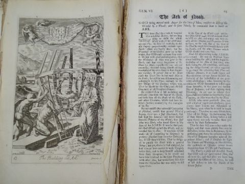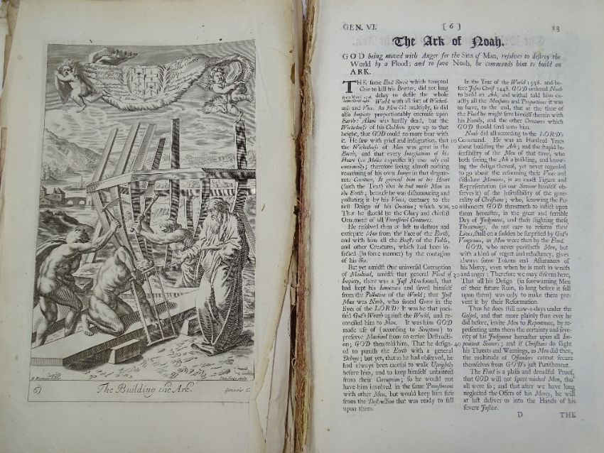 1712 BOOK OF THE BIBLE, History of The Old & New Testament extracted from The Sacred Scriptures, The Holy Fathers and other Ecclesiastical writers MDCCXII London printed for Jeremiah Bright in Friday Street, James Brooks and John Stewart on London Bridge, and James Holland at The Bible on Ball in St Paul's Church Yard (condition: delicate, lacking spine, tears and losses to covers, unchecked content)
