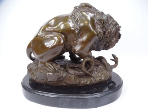 AFTER ANTOINE-LOUIS BARYE REPRODUCTION BRONZE FIGURE of a lion attacking a snake on an oval black marble base, 23cms H, 29cms L, unsigned