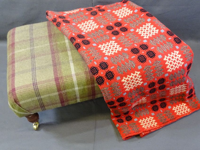 VINTAGE WELSH WOOLLEN BLANKET and a modern tartan covered footstool on brass castors, the blanket with red and black traditional reversible pattern, 216 x 180cms approx (appears with slight staining, some pet hair, one 4 x 4cms hole just off one edge, with one or two smaller holes apparent and some slight edge fraying), 37cms H, 82cms L, 52cms W the footstool