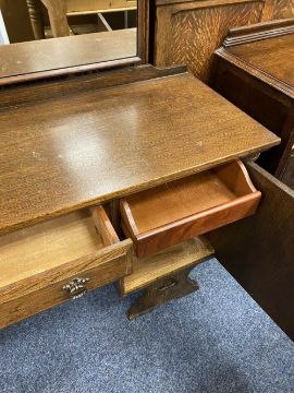 PRIOR STYLE OAK THREE PIECE BEDROOM SUITE, headboard and a small three drawer chest, the suite consisting of lady's and gent's two door wardrobes, 188cms H, 130cms W, 57cms D and 167.5cms H, 111cms W, 48cms D, mirrored dressing table 133cms overall H, 146cms W, 44cms D, the wardrobes with Gothic type carved panels and linenfold detail, 93cms H, 141cms W the headboard, 80cms overall H, 61cms W, 44.5cms D the small chest