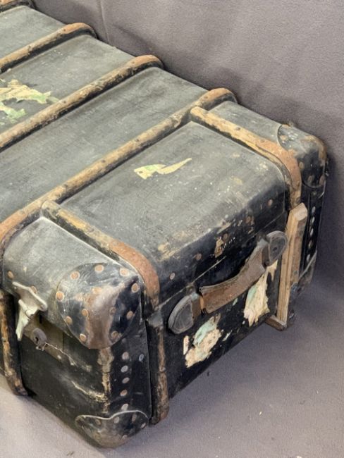 VINTAGE WOODEN BANDED STEAMER TRUNK with lift-out interior tray and leather carry handles initialled ' R G L' to the front, 33cms H, 94cms W, 50cms D