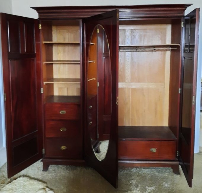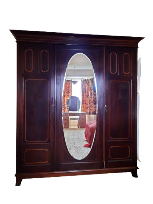 CIRCA 1900 INLAID MAHOGANY TRIPLE WARDROBE having central oval mirrored door and flanking boxwood inlaid four panel doors with interior shelves and drawers on corner bracket feet, 218cms H, 200cms max W, 54cms D