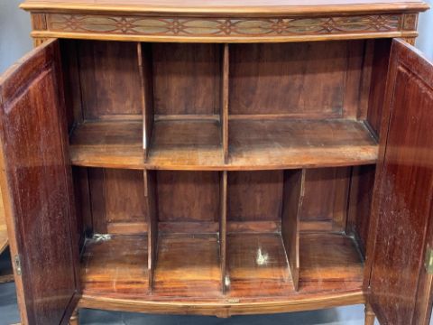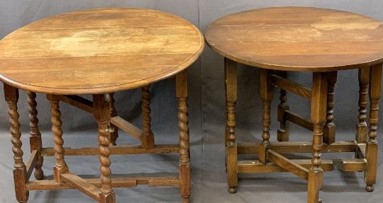 EARLY 20TH CENTURY MAHOGANY BOW FRONTED RECORD CABINET, 119.5cms H, 111cms W, 47cms D and an oak barley twist gateleg dining table and one other with two Edwardian cane seated chairs, 74cms H, 91cms L, 49cms W and 73.5cms H, 85cms L, 33cms W the two tables closed