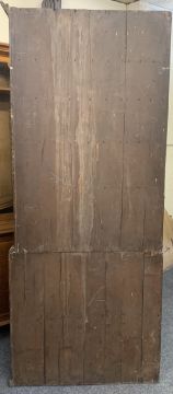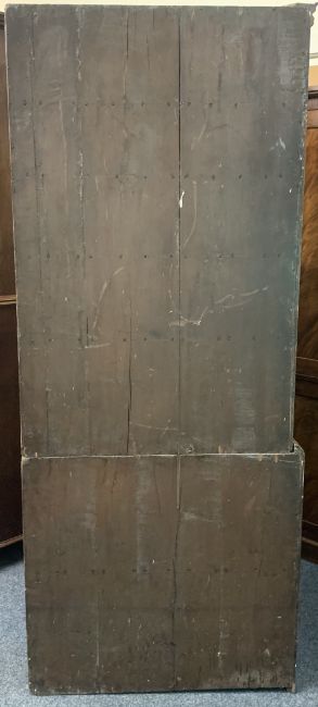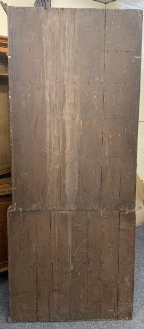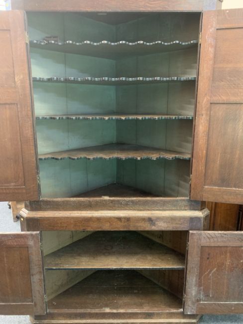 19th CENTURY CORNER CUPBOARD - two piece, having two upper and two lower doors all with fielded panels and interior shaped shelves, 212 x 125 x 69cms