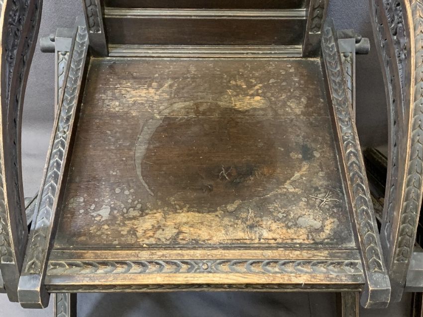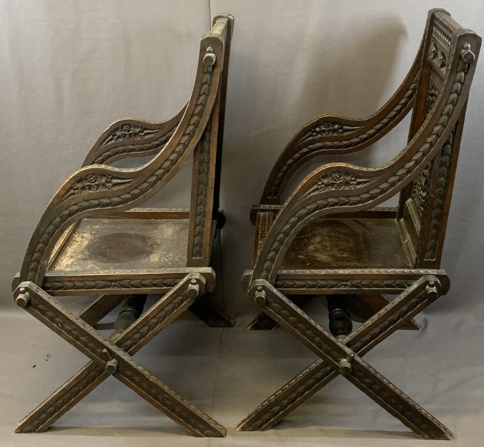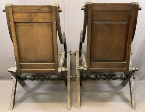 CARVED OAK CAMPAIGN STYLE ARMCHAIRS, A PAIR, pegged for dismantling construction with carved detail to the various parts, the seat backs with central shield, Star of David motif and turned under-seat stretcher, 114cms H, 73cms max W, 49cms seat depth