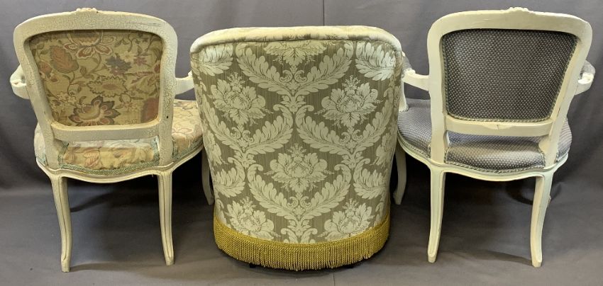 FRENCH STYLE ELBOW CHAIRS in cream colour (2), 86cms H, 60cms W, 47cms seat depth and an upholstered lady's parlour chair, 83cms H, 64cms W, 47cms D