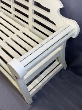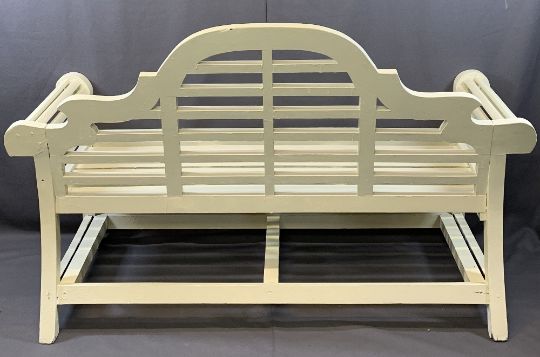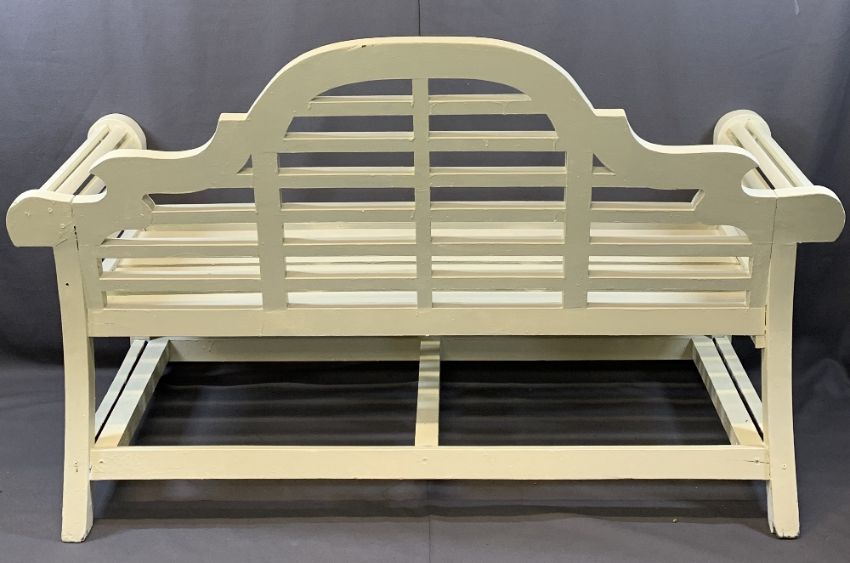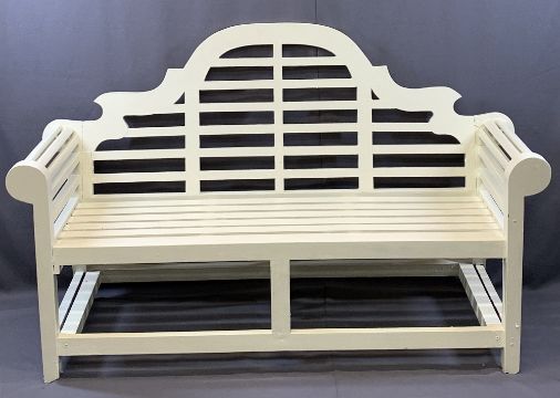 WOODEN GARDEN BENCH - painted and with shaped back, 104cms H, 166cms W, 64cms D