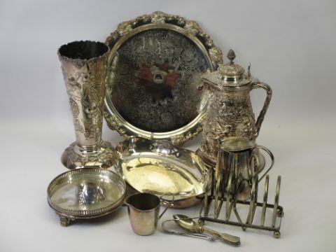EPNS HEAVILY EMBOSSED COFFEE POT, vase and other plated items