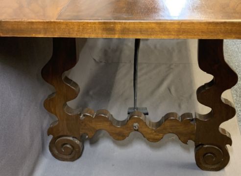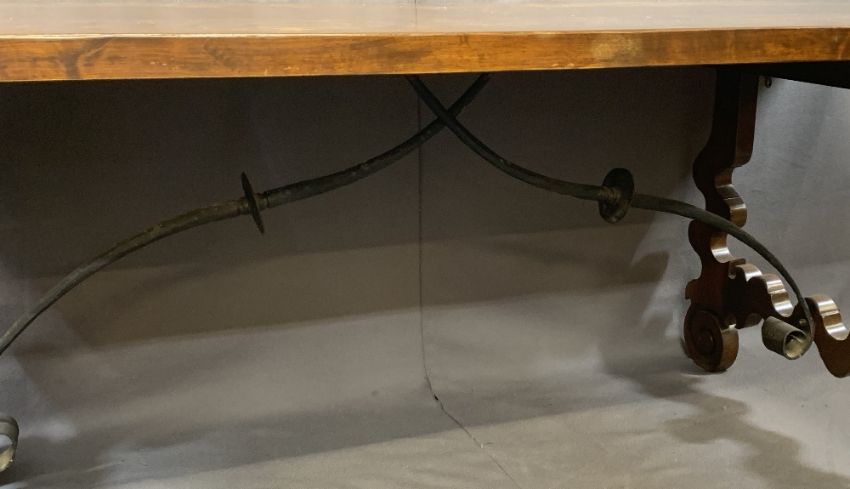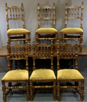 KENDAL MILNE REPRODUCTION OAK FINISH DINING TABLE & 6 CHAIRS, rectangular top on scrollwork end supports with conjoining ironwork stretcher, 73.5cms H, 200cms L, 80cms W, the chairs with block and turned backs and supports with drop-in upholstered seats, 101cms H, 46.5cms W, 38cms seat depths