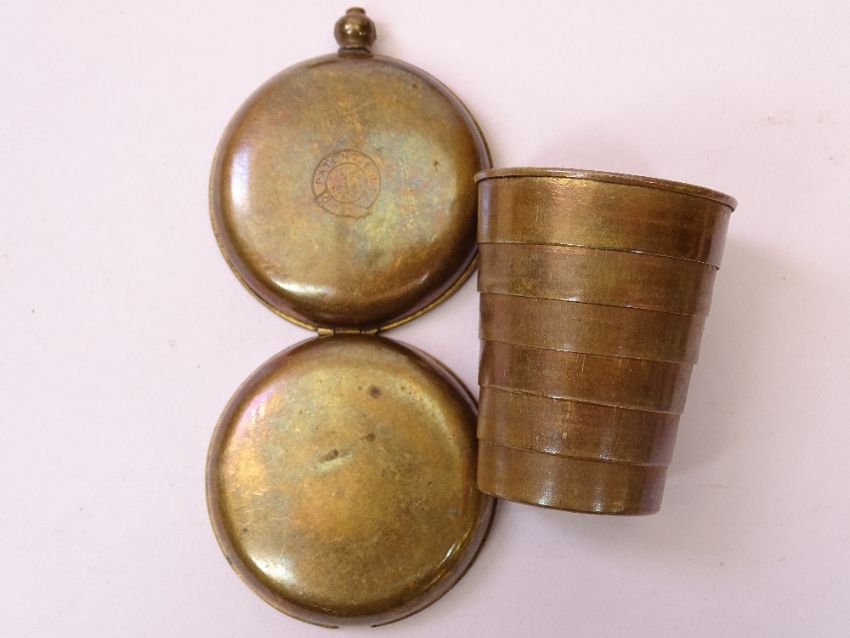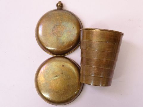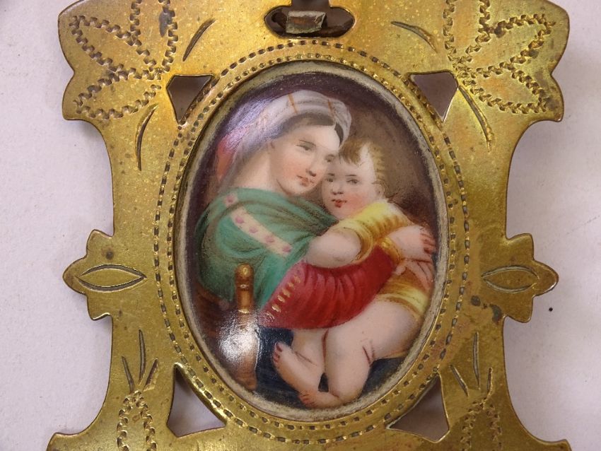 19TH CENTURY FRENCH PORCELAIN MADONNA & CHILD PLAQUE IN BRASS FRAME, Regency tortoiseshell trinket box, folding brass cup in pocket watch style case, sealing wax stamps ETC