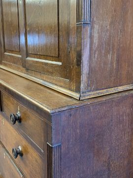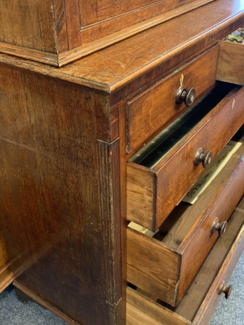 19th CENTURY OAK PRESS CUPBOARD, two piece, having a two door, three shelved upper section over a base of two short and three long drawers, turned knobs with mother of pearl detail, on bracket feet, 223 x 125 x 55cms
