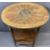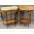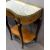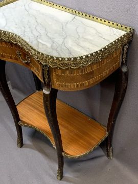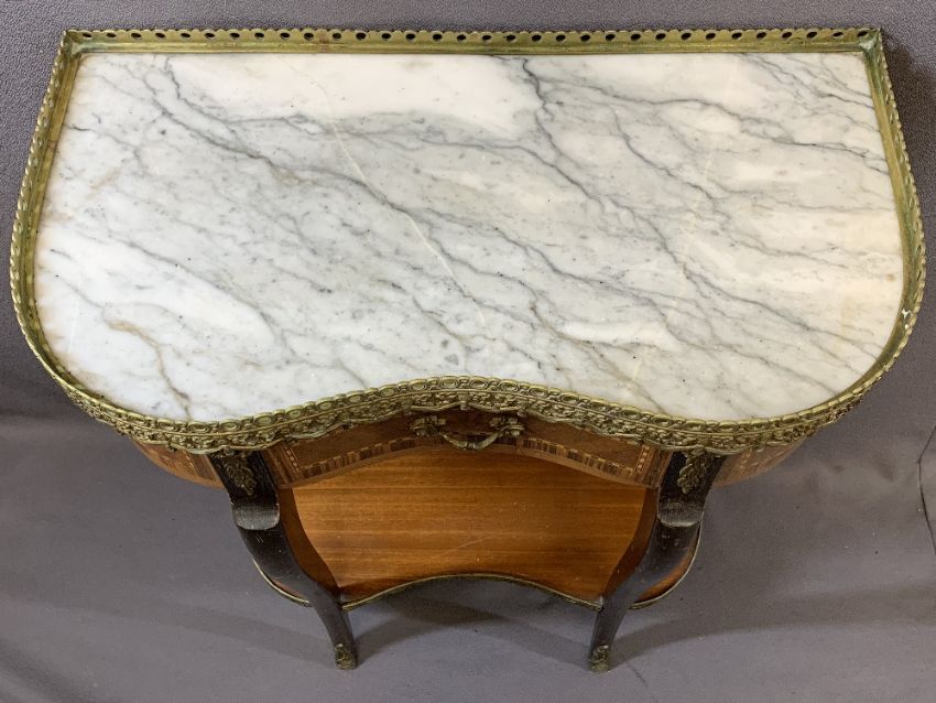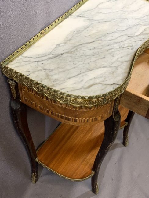 FRENCH, KINGWOOD STYLE 2 TIER TABLE with shaped marble top and brass gallery, single drawer and base shelf, 76cms H, 63cms W, 33cms D, also a further oval brass mounted two-tier table with distressed top, 75cms H, 56cms W, 42cms D