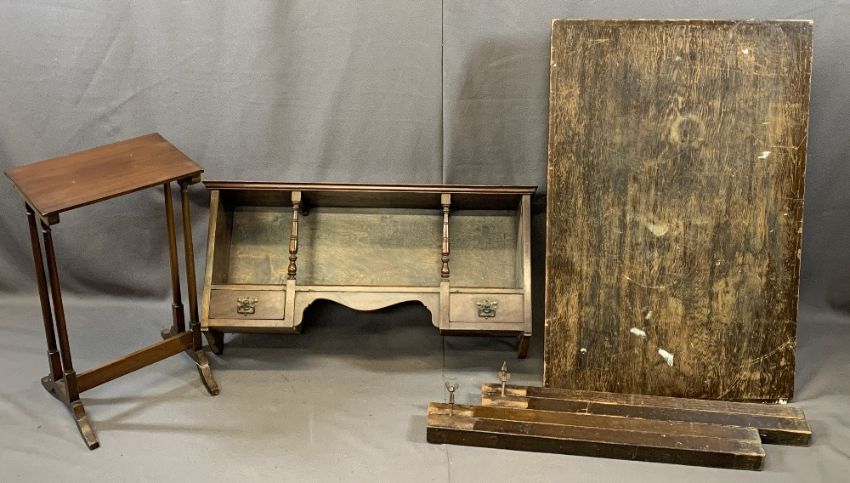 NARROW STANDING GLAZED PANELLED CORNER CABINET, 122cms H, 45cms W, 34cms D, an oak wall mounted bookcase, small side table and an oak table with four screw-in legs, various measurements