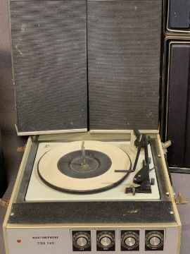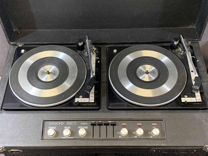 VINTAGE RECORD PLAYERS (2) including a Marconi phone stereo record player, Model No 4025 with clip-on twin speakers, Serial No 6403 and a Diamond Disco twin deck stereo record player in travel case with twin speakers (no leads) plus two additional speakers