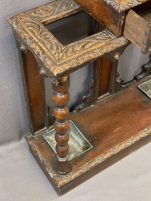 CARVED OAK HALL STAND with drip trays and central drawers, 93cms H, 79cms W, 28cms D, stamped 'Edwards & Roberts'