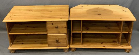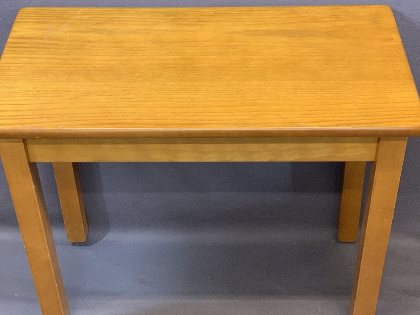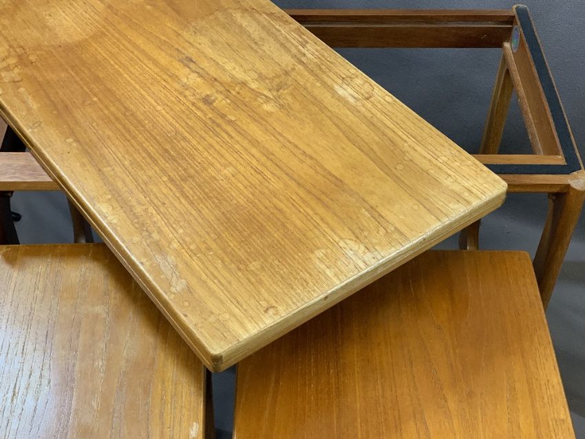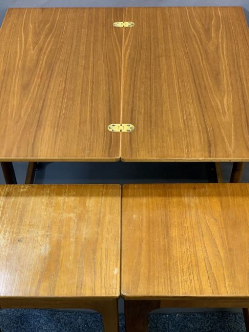 MID-CENTURY MACKINTOSH NEST OF TABLES, 61cms H, 74cms W, 41cms D (closed) with swivel top, a teak side table and two items of pine furniture, various measurements