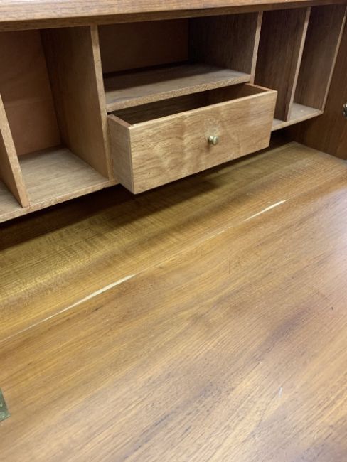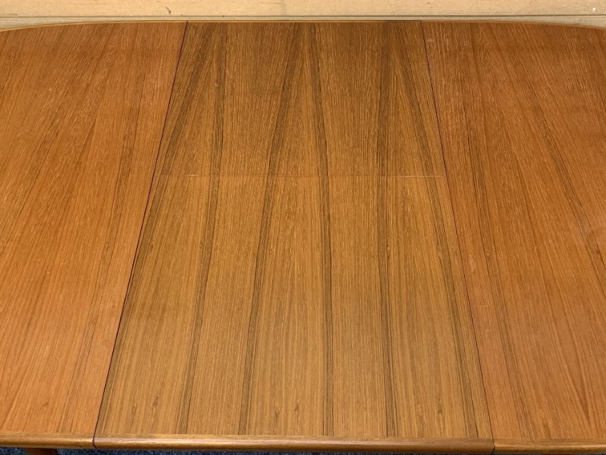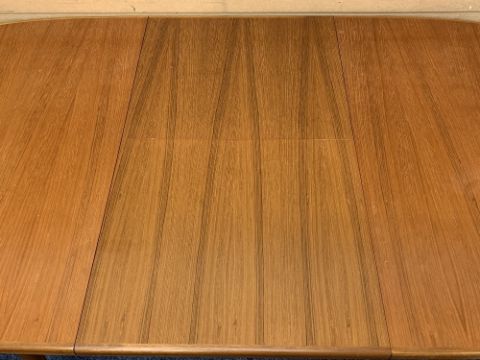 MID-CENTURY TEAK DINING SUITE of extending dining table with fold-out leaf, 76cms H, 151.5cms L, 98cms W closed, fall-front bureau with three lower drawers on tapering supports, 107cms H, 76cms W, 37.5cms D along with six (4 + 2) chairs which have been offered as a gift by the vendor