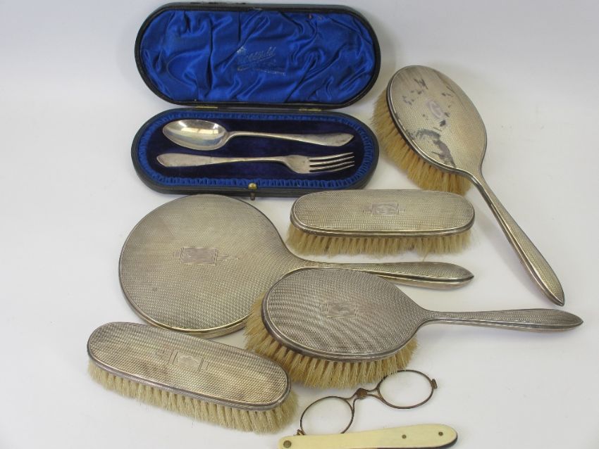 SILVER DRESSING TABLE SET, five pieces to include four brushes and a mirror, Sheffield 1946/7, a pair of folding glasses with a bone handle and a cased silver fork and spoon, Sheffield 1907 the fork and Sheffield 1906 the spoon, 2 troy ozs (the fork and spoon)