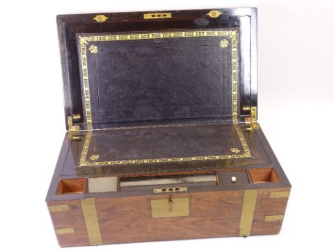 WALNUT WRITING BOX - brass banded with key and tooled interior, 49 x 26cms and a two-door stationery box