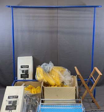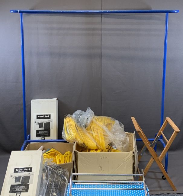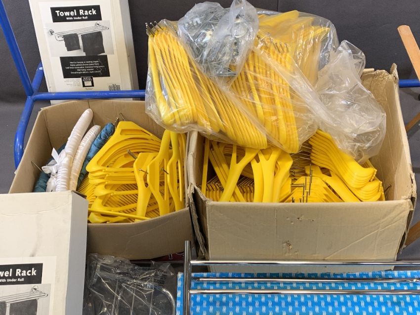 HANGING RAIL ON CASTORS, LARGE THREE RUNG BLUE, 162cms H, 150cms W, 60cms D, two boxes full of 180 yellow security coat hangers, approximately 230 rings and a selection of fabric hangers, three boxed and unused stainless steel towel racks and a wooden luggage rack