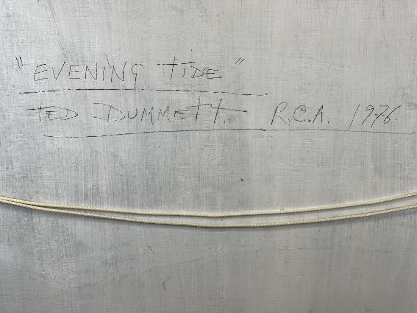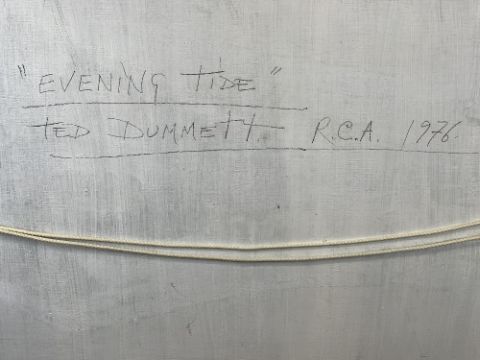 TED DUMMETT oil on board - coastal view with sunset and yachts, entitled verso 'Evening Tide' and dated 1976, signed, 49 x 74cms
