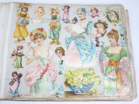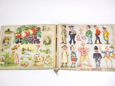 VICTORIAN SCRAP ALBUM - 40 plus covered pages and a small framed woolwork tapestry