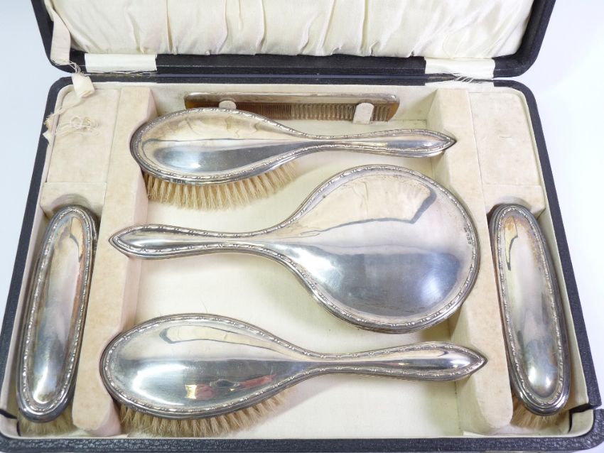 CASED SILVER HAND MIRROR, BRUSH & COMB DRESSING TABLE SET, 6 PIECE, Birmingham 1925 and 1926, Maker Israel Sigmund Greenberg