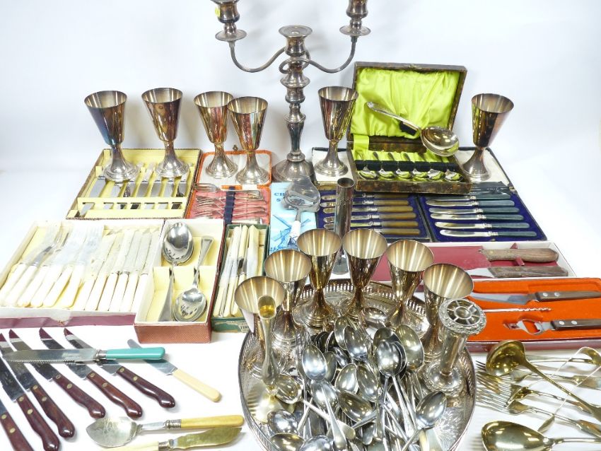EPNS - cased and loose cutlery, twin branch candelabra, galleried tray and goblets ETC
