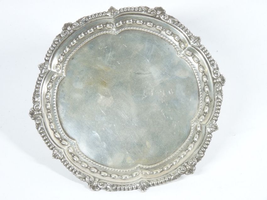 CIRCULAR CALLING CARD TRAY with raised detail to the rim, London 1906, maker Mappin & Webb Ltd, 5.9 troy ozs, 17.5cms diameter