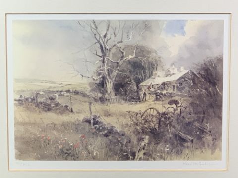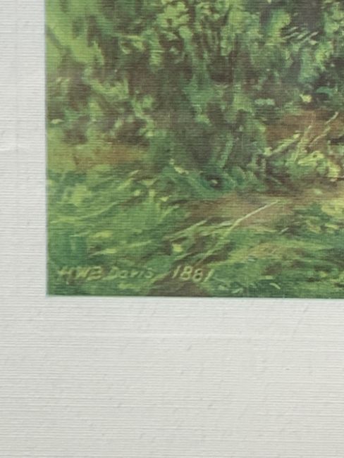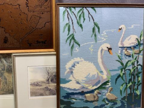 H W B DAVIES 1881 print - mother and son, 28 x 40cms, KEITH ANDREW print - 'Summer', 29 x 39cms and a rural scene print 791/850, 17.5 x 24.5cms. Also, a woolwork tapestry of swans and a copper tinted map of Anglesey